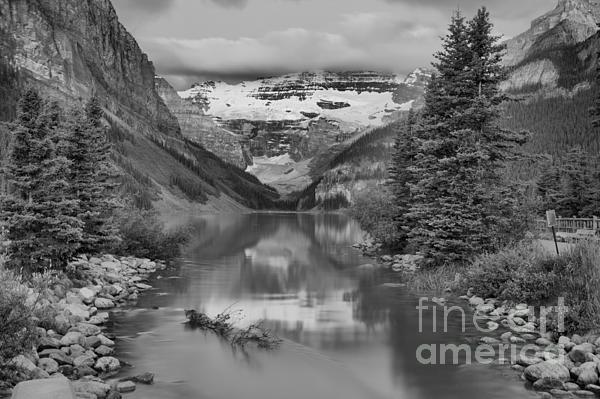 A Black And White View Of Lake Louise And The Victoria Glacier And Surounding Canadian Rocky Mountain Peaks Reflecting In The Lake Just After Sunrise... more