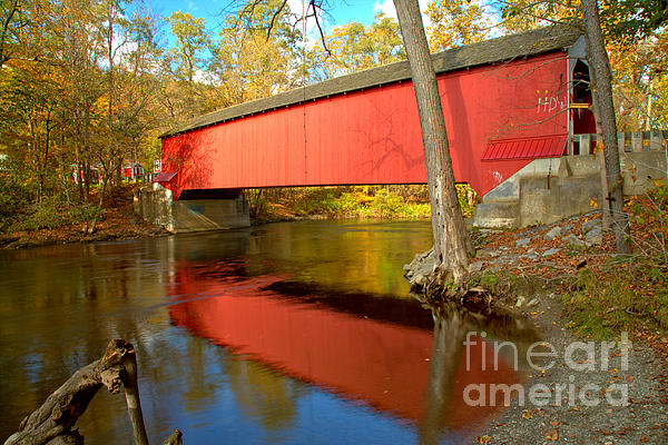 The Bright Red Eagleville Covered Bridge Crosses The Battenkill River In Washington County In Rural New York.