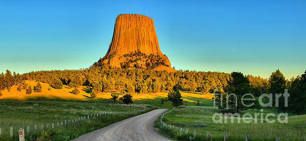 A Large Panoramic Sunset View Of Devils Tower And The Old Dirt Road Leading Up To This Stunning Tower In The Bear Lodge Mountains In The Black Hills... more