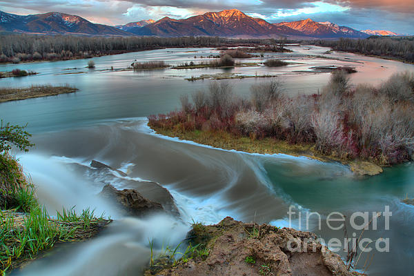 As The Sun Sets, The Mountains Towering Over The Snake River Glow As Seen From The Top Of Fall Creek Falls In The Swan Valley Area Of Idaho.