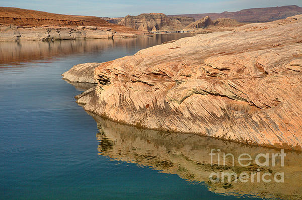 Textured Sandstone Formations Reflect In The Calm, Cool Waters Of Lake Powell Near The Town Of Page In Northern Arizona On A Cool Winter Day.