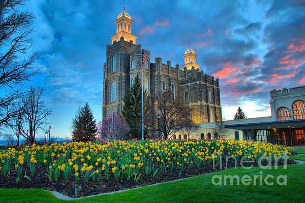 A Dash Of Color Lights Up The Skies Over The Logan, Utah Mormon Temple And The Surrounding Blooming Flower Gardens On A Cool Spring Evening.