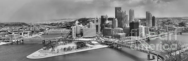 A Black And White Panoramic View Of Downtown Pittsburgh On A Frigid Winter Day After The First Snow Storm Of The Season As Storm Clouds Fill The... more
