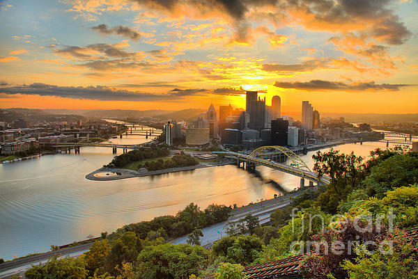 A Fiery Sunrise Lights Up The Skies Over Downtown Pittsburgh, Pennsylvania On A Cool Summer Morning Where The Three rivers Come Together At Point... more