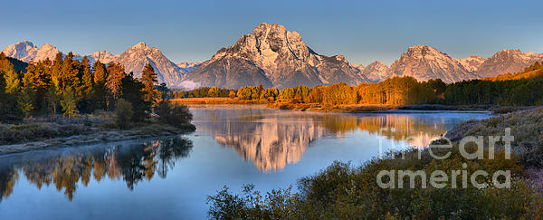 The Snow Covered Teton Mountain Range Reflects in The Snake River At Oxbow Bend On A Crisp Fall Day In Wyoming.