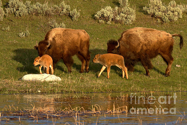 A Pair Of Mother Bison Stroll Along An Ephemeral Pond In The Northern Range Of Yellowstone National Park As The Spring Sun Brings Out A Beautiful Reddish Glow On Their Newborn "Red Dog" Calves On A Cool Spring Afternoon.